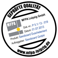 Die Saxoboard Duschelemente mit Vliesabdichtung haben ein bauaufsichtliches Prüfzeugnis nach Bauregelliste (A, Teil 2, Nr. 2.50) der MFPA mit dem Siegel "Geprüfte Qualität".